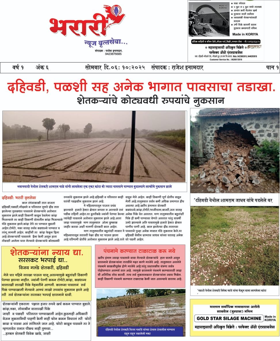 आपला जिल्हा ताज्या बातम्या सामाजिक दुष्काळी माण …आता पावसाने हैराण. मुख्य संपादक : श्री.राजेश विजयकांत ईनामदार October 7, 2025 1 min read Post Views: 136 Tags: नुकसान पाऊस पिके वाया शेतकरी Continue Reading Previous: शेनवडी फाटा येथे देवदर्शनावरून परतताना भीषण अपघात ! एकाचा जागीच मृत्यू, एक जखमीNext: नवऱ्याने केला बायकोचा खून… स्वतःला लावला फास… दोन जीवांचा दुर्दैवी अंत Leave a Reply Cancel replyYour email address will not be published. Required fields are marked *Comment * Name * Email * Website Save my name, email, and website in this browser for the next time I comment. Related Stories माण तालुक्यात राष्ट्रवादी काँग्रेस पुन्हा फ्रंट फूट वर 1 min read आपला जिल्हा महाराष्ट्र राजकीय माण तालुक्यात राष्ट्रवादी काँग्रेस पुन्हा फ्रंट फूट वर February 9, 2026 दहिवडी त वंदे मातरम् चे गायन उत्साहात 1 min read Uncategorized ताज्या बातम्या देशविदेश धार्मिक महाराष्ट्र राजकीय शैक्षणिक सामाजिक दहिवडी त वंदे मातरम् चे गायन उत्साहात November 9, 2025 तीन नोव्हेंबर रोजी वकिलांचे काम बंद आंदोलन 1 min read आपला जिल्हा ताज्या बातम्या महाराष्ट्र सामाजिक तीन नोव्हेंबर रोजी वकिलांचे काम बंद आंदोलन November 2, 2025
