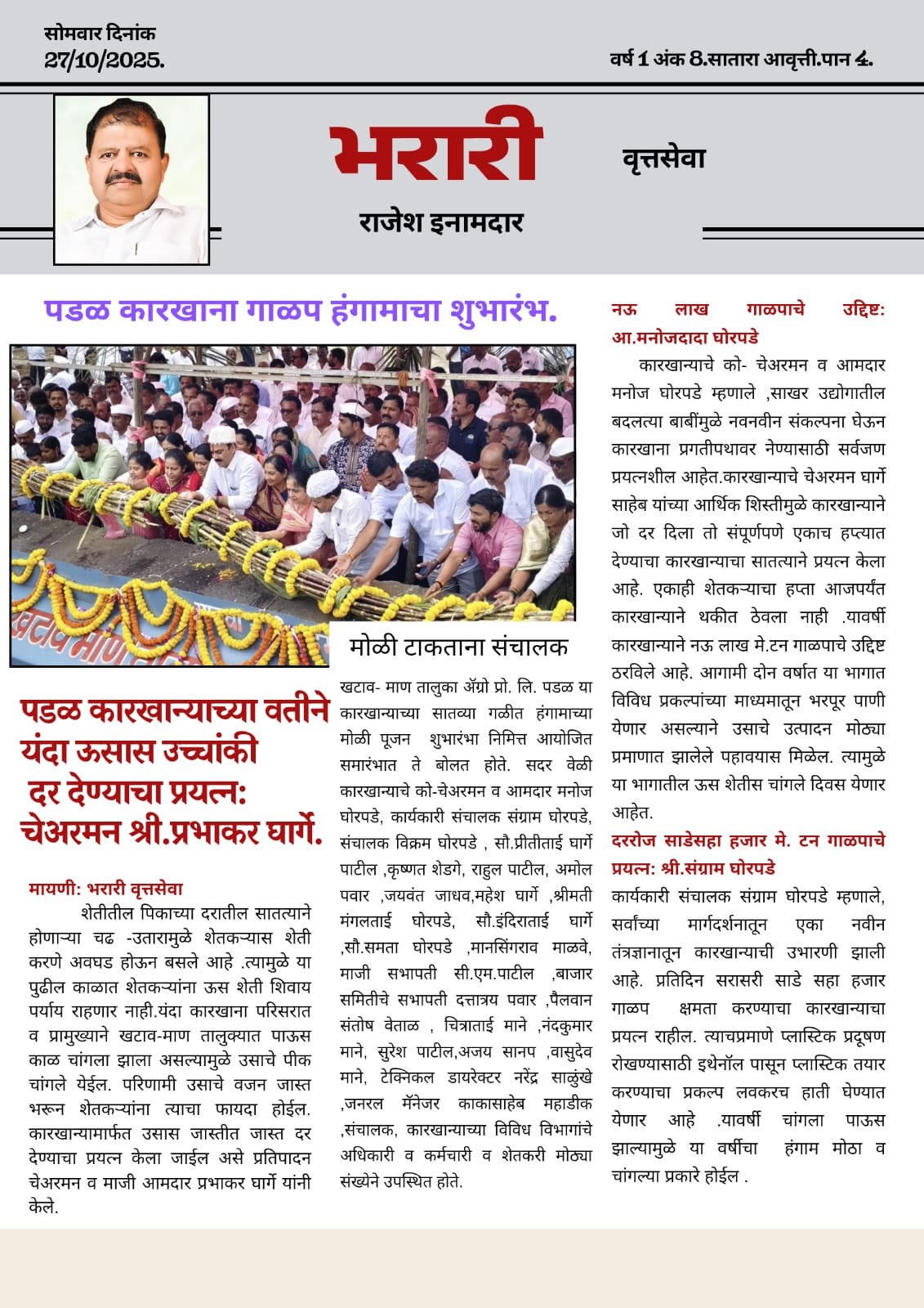 आपला जिल्हा ताज्या बातम्या महाराष्ट्र सामाजिक पडळ कारखाना सुरू;शेतकऱ्यांसाठी आनंदाची बाब मुख्य संपादक : श्री.राजेश विजयकांत ईनामदार October 27, 2025 1 min read Post Views: 311 Tags: CM Co.chairman Manoj ghorpade Dar Denar Karkhana Padal Prabhakar gharge Sakhar Uchhanki Continue Reading Previous: स्व चंद्रकांत वसव यांना मरणोत्तर जीवनगौरव पुरस्कारNext: झाडे लावणे काळाची गरज:ना.गोरे Leave a Reply Cancel replyYour email address will not be published. Required fields are marked *Comment * Name * Email * Website Save my name, email, and website in this browser for the next time I comment. Related Stories माण तालुक्यात राष्ट्रवादी काँग्रेस पुन्हा फ्रंट फूट वर 1 min read आपला जिल्हा महाराष्ट्र राजकीय माण तालुक्यात राष्ट्रवादी काँग्रेस पुन्हा फ्रंट फूट वर February 9, 2026 दहिवडी त वंदे मातरम् चे गायन उत्साहात 1 min read Uncategorized ताज्या बातम्या देशविदेश धार्मिक महाराष्ट्र राजकीय शैक्षणिक सामाजिक दहिवडी त वंदे मातरम् चे गायन उत्साहात November 9, 2025 तीन नोव्हेंबर रोजी वकिलांचे काम बंद आंदोलन 1 min read आपला जिल्हा ताज्या बातम्या महाराष्ट्र सामाजिक तीन नोव्हेंबर रोजी वकिलांचे काम बंद आंदोलन November 2, 2025